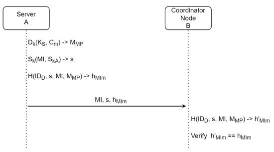 The last phase of the protocol begins when entity B uses a hash function with the values of the identifier of entity D and the message , such that . The output of this function is sent together with the signature and the message to entity D. Subsequently, entity D must verify the hash value it receives with the one it calculates, to verify the integrity of the information. Once this has been checked, s, , and are taken as inputs to give as output a Boolean value determined by the verification function that defines if the signature is authentic and therefore safe to be applied by the actuators on the patient’s body. Figure 9 shows the phase diagram, where all the functions performed by each of the entities can be seen.