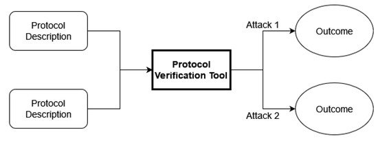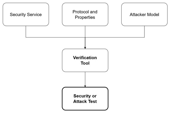 Protocols are instructions that follow a strict sequence to generate good communication between entities. In a cryptographic protocol, the information travels protected using some cryptographic primitive. In this context, protocols are intended to provide confidentiality, entity authentication, information integrity, and non-repudiation. Protocols can be prone to security or semantic failures. Hence, different tools help in the formal verification of protocols. These tools verify the cryptographic properties of protocols, including their semantics and security, under certain scenarios raised in the tools. The methodology used by verification tools is specified in [37]. This methodology uses security services, the protocols designed together with the properties to be tested, and the model of the attackers. In this way, verification tools can obtain proof of the security of a protocol or the description of the attacks that can be performed on it. Therefore, it is possible to know if the protocol is well constructed or not. Figure 10 shows this methodology graphically. Some tools, in the results, provide information about the attacks that can be performed on the protocol to correct security breaches.