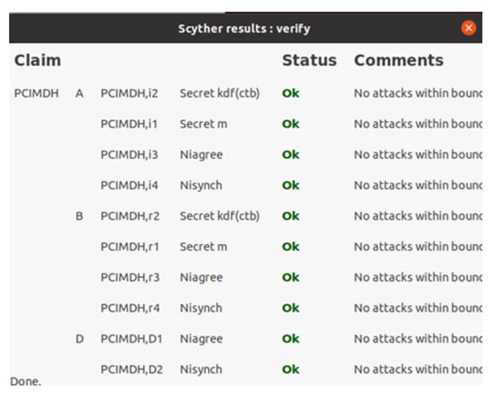 Some of the results obtained with Scyther are shown in Figure 13. The results are displayed in columns; the first column specifies the name given to the protocol. In such case, is an acronym for “Cryptographic Protocol for Medical Information in Heterogeneous Devices”; the second column shows the entity; the third column shows the communication within the protocol, that is, the side of the communication between the entities being reviewed. The next column shows the claim that is being sought; in the case of secrecy, the data that is sought is also shown, whether it is secret; in our case, it will be the symmetric key that is being obtained with a function and the value and the message. The last two columns show the result of the claim and the comments on the claims. The results produced by the tool show only , indicating that the property that was demonstrated has been verified. In the comments, the legend No attacks within bounds is shown, meaning that there are no attacks within the limits specified in the tool.