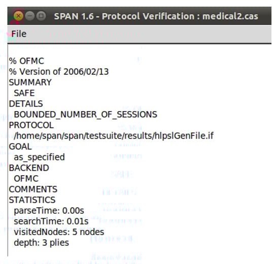In this case, only the results of the OFMC model are shown, but it should be noted that in the remaining models that the tool can verify, the protocol also has “SAFE” results.