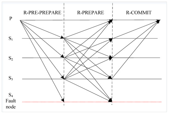 - Remove the client node. In the traditional PBFT algorithm, the request phase and the reply phase occur between the client and the master nodes. However, in the blockchain structure, information is broadcast between nodes in the form of P2P, without the participation of the client. Therefore, we remove the request and reply phases of the client node in the consistency protocol, modify the C/S structure of PBFT to a distributed topology, and divide all nodes into master and slave nodes.