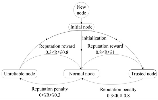 - Introduce reputation mechanism. The main purpose of the reputation mechanism is to make the nodes with high reliability easier to be elected as the master node. Each node will be divided into different reputation levels according to the reputation value, and then each node will be rewarded or punished based on its performance in each round of consensus. According to a preset reputation threshold, nodes can be dynamically transformed in different reputation levels.