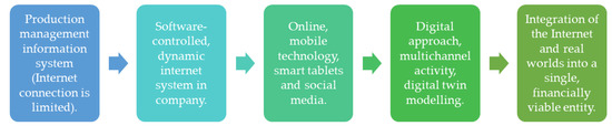 Smart networked factories are configured by computer-assisted technologies merging cyber-physical production systems and leveraging Internet of Things-based real-time production logistics. In addition to product decision-making information systems, Industry 4.0 integration depends on organizational structure, IT proficiency, and strategic-minded management. This research followed the five stages of digital evolution in firms [63] (see also Figure 1):