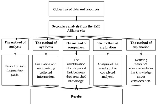 For the analysis, data from the European Commission, OECD, and Statista were also utilized as well as screening and quality assessment tools (AMSTAR, AXIS, Dedoose, Distiller SR, MMAT, ROBIS, and SRDR). In addition to research on the added value of the non-financial sector, the analyses were based on this topic. The research was also conducted by utilizing secondary data analysis from the SME Alliance. To process the secondary data, the following scientific methods were used (Figure 2): (i) the method of analysis that examines a complex research problem by its decomposition into partial sections. In the presented study, the method of analysis was used to investigate the knowledge available in domestic and foreign literature in the mapped research area; (ii) the method of synthesis, which is used in processing and synthesizing acquired knowledge; (iii) the method of comparison, the result of which is the discovery of a mutual relationship between the researched knowledge, phenomena, or objects, which makes it possible to gain new knowledge about the researched issue; (iv) the method of exploration used to better understand the existing problem. In this study, this method was used in the interpretation of the outputs of the performed analyses; (v) the method of explanation is aimed at deriving theoretical conclusions from the examined knowledge, which is organized into logical contexts and causal dependencies, which is the basis for the creation of theoretical conclusions about the research problem [66]. The inquiry also included comparative analysis. A total of 56.5% of German businesses are not entirely compliant with Industry 4.0 deployment criteria, according to a survey of 268 businesses [18]. A total of 20% of respondents were only somewhat prepared for the beginner level 1 implementation method. Only 0.3% were regarded as exceptional, attaining level 5 implementation across all criteria (Table 4).