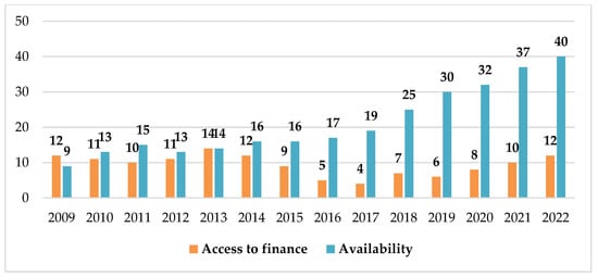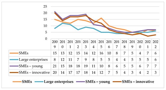 Businesses may have difficulty receiving external financing due to their reluctance to seek for it out of fear of rejection, or because they would receive an unacceptable loan amount or one with a high interest rate. The documentation needed in submitting a request for financial help may be time-consuming and onerous, representing a potential barrier. Other factors, such as the company’s age and amount of innovation, may influence the ease with which SMEs can get external financing [77]. As seen in Figure 8, small and developing enterprises have the most difficulties in acquiring external finance. As a result of more uncertainty, the possibility of receiving financing is diminished for enterprises whose major focus is on creative operations, despite the fact that mature SMEs have better possibilities. Due to the fact that many SMEs rely solely on a single source of capital, financing strategies should be diversified.