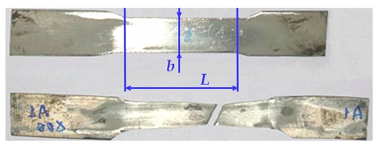 During a traffic accident, the crumple zones of a vehicle are subject to plastic deformations (plastic deformation waves develop), and the geometry of the entire structure changes. During the post-accident repair of the vehicle, the geometry of the safety elements of its structure must be restored. The present study deals with the effects that may alter the characteristics of these elements, i.e., plastic deformations, when the elements are being straightened back by tensioning, bending, and hammering. An appropriate description of the material is required to be able to design the numerical models. For this purpose, material tension tests were performed to determine the mechanical properties of the materials of the elements investigated and the influence of process-related effects on them. Flat tensioning samples were prepared and the experiments were carried out according to the requirements of standard LST EN 10002-1:2003 [46]. Measurements of the test part of the plates used for the tests were L = 55 mm, b = 20 mm (Figure 1).