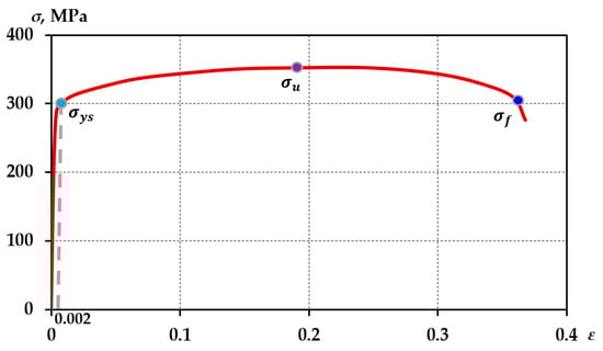 The second model is based on the exponential hardening function (Figure 3, curves (3) and (4)). In this model, the relationship between the stresses and deformations is expressed as follows: