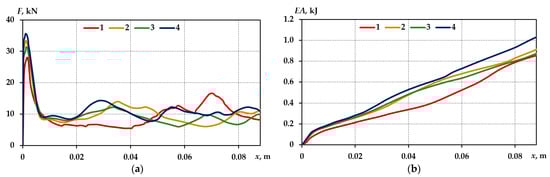 Buckling force (a) and absorbed energy (b) diagrams of the T1 section element, when the material is approximated with different descriptions; (1—in situ experiment; 2—by approximation with tangent modulus; 3—by approximation with exponential hardening function without accounting for the values of true stresses at break; 4—by approximation with exponential hardening function by accounting for the value of true stresses at break).
