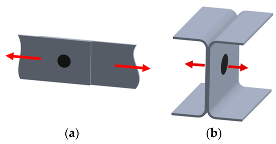 Additional investigations were conducted to assess the process-related factors. For the design of the numerical model of the sample with a rectangular or other cross-sectional shape and with spot-welded joints and being subjected to buckling, forces required to break the spot-welded joint in axial and longitudinal (shear) direction must be available in addition to the material properties. For this purpose, the specimens (Figure 5) were produced according to the specifications of the vehicle design guide [47]. The shear and axial forces necessary to break the joint were measured for the specimens by quasi-static tensile tests using the universal 50 kN UMM-5T testing machine (Kaunas University of Technology, Kaunas, Lithuania).