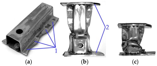 P1 specimen used for the experiment: before the test (a); after the first test (b); after the second test (c); (1—positions of the spot-welded joints; 2—fixing plates).