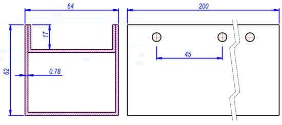 The thin-walled 200 mm long element resembled the crumple zone elements used in vehicles, e.g., VW Polo, in terms of cross-section shape, structure, and assembly technique. Measurements of the specimen cross-section and layout scheme of the spot-welded joints are presented in Figure 9. A symmetrical layout of spot-welded joints was used for the specimen. The specimen had 10 spot-welded joints.