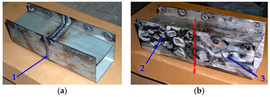 Figure 10. Specimens simulating the properties of longitudinal member restored after a traffic accident: transversely cut and welded at the centre (a); made of the material hardened by plastic deformation and annealed (b) (1—weld; 2—part of specimen made of the plastically strained material; 3—part of specimen made of annealed material). - specimen made of the material hardened by plastic deformation, with of the specimen span made of thermally treated material (Figure 10b). The specimen simulated the effect of minor geometric deviations and changes in the material during the repair.