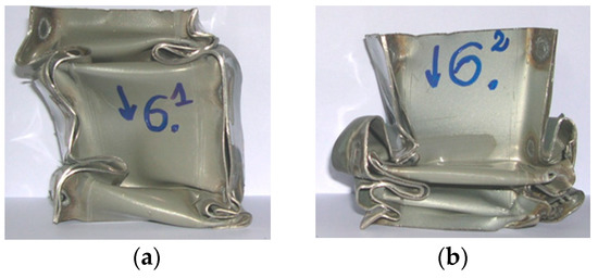Specimens after the dynamic buckling experiments: specimen without broken spot-welded joints (a); specimen with two broken spot-welded joints (b).
