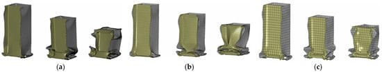 In this paper, FE models were developed for the simulation of quasi-static experiments according to the geometric measurements of the specimen used in the in situ experiments with the FE software LS-Dyna V.971. Nodes located on the bottom of the specimen were fixed in all directions x, y, and z. For nodes located at another end of the specimen, the command ‘BOUNDARY_PRESCRIBED _MOTION_SET’ [49] was used to set the constant motion speed (v = 5 m/s) in the vertical direction y, and maximum possible displacement was set for the nodes. During deformation, the command ‘CONTACT_AUTOMATIC_SINGLE_SURFACE’ [49] was used for simulation of the contacting surfaces of the element. Potential displacement during straightening out of the longitudinal member was introduced as the deflection directed inside. These geometric deviations were simulated in the model by sliding the respective nodes in x and/or z directions.