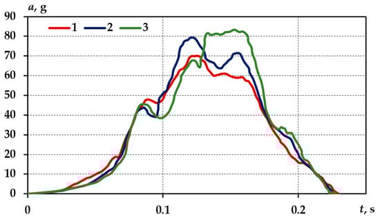 The values of stress and time of the accelerometer sensors were generated and registered during the experiment. The stress values registered by the sensors during the experiment and saved on the computer were adjusted for the characteristics of the sensors used and recalculated into acceleration. The obtained acceleration—time dependences were later recalculated into force—displacement dependences. The amount of absorbed energy (area limited by the force and displacement curve) was obtained by integrating the force—displacement curve. The amount of absorbed energy was compared to the real amount of kinetic energy of the impactor mass.