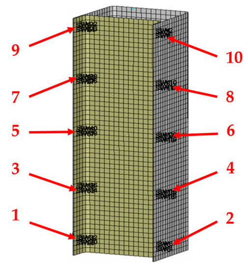 For modelling the dynamic loading experiments, the nodes located on the bottom of the specimen were connected to the fixed plate referred to as S4 in the model. Moreover, plate S3 was designed to impact the investigated specimen. The load was created by attributing the required mass and initial velocity ‘INITIAL_VELOCITY‘ to plate S3 nodes. Spot-welded joints ‘CONSTRAINED_SPOTWELD_ID‘ were designed in the model. For each joint, parameters SN (force in axial direction) and SS (force in shear direction) were entered. In the model, one spot-welded joint had eight nodes, i.e., four pairs of two interconnected nodes. In this case, the value entered for SN and SS in the LS-Dyna subprogram was equal to ¼ of the value of the forces obtained during the in situ experiments.
