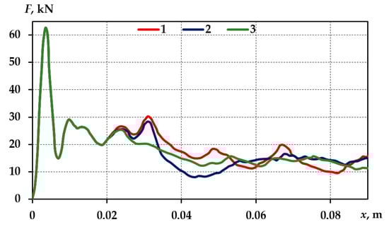 The adjustment of description of the crumple zone properties enabled more accurate reflection of the effect of changes in element properties on the deformation process of the entire crumple zone and on the overloading of the part of the 3rd crumple zone that was directly related to the crew. In this case, the elastic deformation model was used before plastic deformation emerged. After the plastic deformation started, the deformation progress calculation was altered depending on the process velocity: if then ; if then . During the change of the deformation velocity sign, value was registered, and the calculation was then performed using , irrespective of the sign, until the value was higher than x*. After x* had been reached, the deformation process returned to the former conditions and .