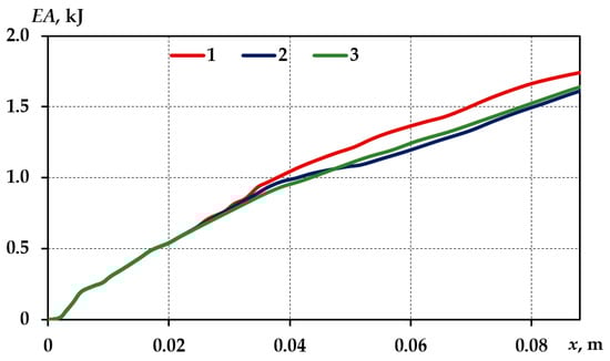 The amount of the absorbed energy was obtained having estimated the area, restricted with a force—shift diagram: