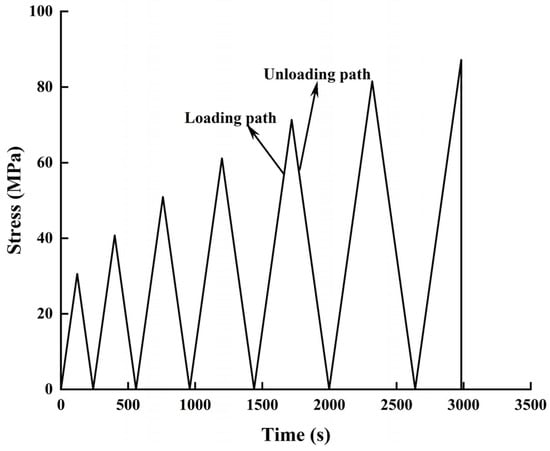 The adopted test was the cyclic loading test. The sandstone cyclic loading tester is shown in Figure 2. First, according to the uniaxial compression test of sandstone, the unconfined uniaxial compressive strength of sandstone was determined to be 87.6 MPa. The cyclic loading test was divided into seven amplitudes, namely 30, 40, 50, 60, 70, 80 and 90 MPa, and the loading and unloading rate was 0.5 kN/s. Each cycle was loaded at a set rate to a specified value and was then unloaded to 0 MPa at the same rate, and six cycles of cyclic loading tests were performed in turn until the specimen was damaged. The specific circulation method is shown in Figure 3.