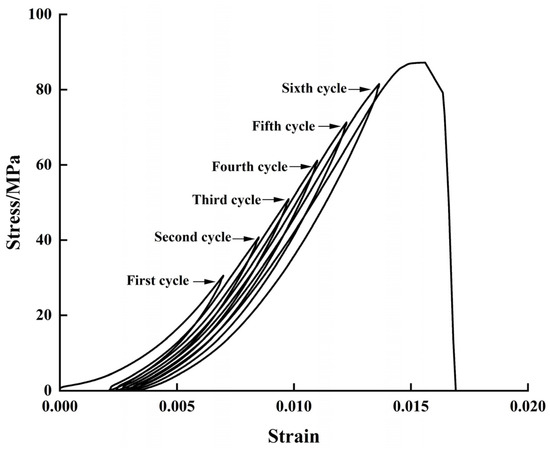 In order to simulate the disturbance effect of engineering instruments on sandstone, a cyclic loading test was designed. The sample test curve under cyclic loading is shown in Figure 4. Under repeated cyclic loading, the loading curve rises roughly along the loading path parallel to the previous grade, showing an obvious rock deformation memory phenomenon [19,20,21,22]. In the course of cyclic loading, the damage of sandstone accumulated continuously, the internal cracks extended continuously, the axial strain increased continuously, the test curves of cyclic loading moved forward continuously and the concave degree increased continuously. At the peak load of the seventh cycle, the rock curve dropped sharply, and the sandstone suddenly lost its carrying capacity.