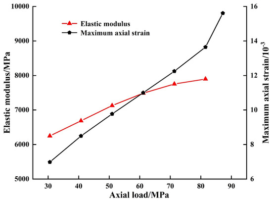 As an important mechanical parameter of rock, the elastic modulus highlights the brittle characteristics of the rock. The elastic modulus under cyclic loading can be obtained from a single cyclic loading curve [23]. In this paper, the elastic modulus of each cycle level was calculated using the peak value of the loading curve and the minimum value of the unloading curve. According to the mechanical indexes of sandstone under different upper limit stresses, as shown in Figure 5, the internal void cracks of sandstone were continuously compacted under the load, and the elastic modulus of rock increased continuously, which could be roughly divided into two stages: rapid growth and stability. As the elastic modulus of rock increased, the brittleness of rock gradually increased until the final unstable failure of the rock.
