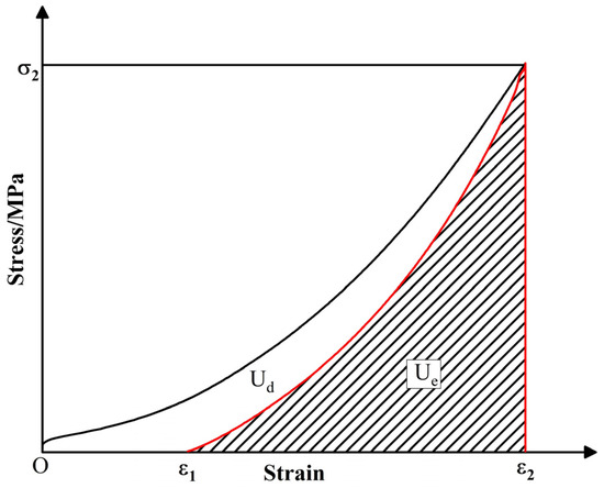 The cyclic loading process is accompanied by the input and output of energy. The energy input during the loading process is partly used for the storage of rock elastic energy and is partly dissipated due to the development of damage inside the rock. The relationship among the three can be obtained according to the first theorem of thermodynamics [24,25,26].
