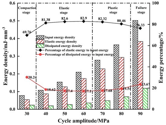 Energy conversion was used to further analyze the damage process inside the rock under different cycle amplitudes. The results are shown in Figure 7. The analysis suggests that the energy transformation process under cyclic loading can be divided into four stages: the compaction stage, elastic stage, plastic stage and failure stage. The curve of the dissipation energy percentage and elastic energy percentage shows obvious groove and inverted groove evolution. In the compaction stage, due to the compaction of pores and cracks in the rock, the percentage of dissipated energy in the input energy was large, but in the compaction stage, the elastic stage and the plastic stage were still dominated by elastic energy storage. In the plastic stage, due to the increase in the unrecoverable plastic strain of the rock, the elastic energy of the rock decreased by 1.86%, and the dissipation energy increased by 1.86%. In the failure phase, the elastic energy of the rock was released, and the dissipation energy increased rapidly, resulting in the loss of the carrying stability of the rock. From an energy point of view, the sudden release of the elastic energy accumulated inside the rock was the internal cause and power source of rock failure.