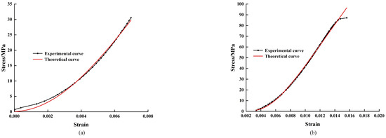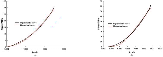 In the process of model validation, the basic physical parameters of the rock are as follows: φ is 45.42° and c is 10.02 MPa. When the data fitting effect of Equation (24) is better, the rationality of the intrinsic model can be confirmed. First, according to the cyclic loading test, the loading and unloading test curves under each cycle amplitude were obtained. Then, using the nonlinear fitting function of the Origin software, combined with the model relationship (24), a new custom fitting function was established with m and λ0 as parameters. The applicability of the model’s establishment was quickly determined according to the fitting correction coefficient R2 through the rapid iteration of the Levenberg–Marquardt method embedded in the software. The fitting curves of the loading stage amplitudes of 30 MPa and 90 MPa and the unloading stage amplitudes of 30 MPa and 80 MPa were randomly selected and compared with the test curves. The comparison results are shown in Figure 9 and Figure 10.