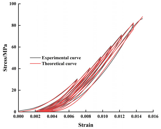 As shown in Figure 9, Figure 10 and Figure 11, except for some deviations in the initial stage, the fitting degree between the theoretical curve and the experimental curve is high. According to the fitting parameters of each cycle level in Table 1, the fitting correction coefficient R2 of the fitting curve of the test data is above 0.99, which also shows that the rock intrinsic relationship has good applicability and rationality. According to the comparison between the loading phase and the unloading phase, the fitting effect of the loading section was better than that of the unloading section. Moreover, the fitting effect of loading and unloading curves with different amplitudes was compared. With the continuous accumulation of rock damage, the fitting effect of the rock test curve is better.