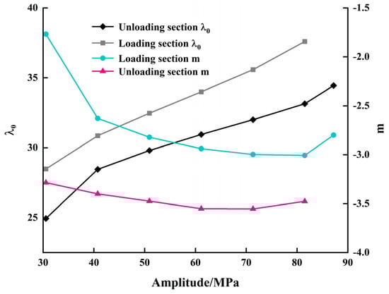 Through the observation of Table 1, the constitutive parameters λ0 and m of the rock in the loading section are smaller than those in the unloading section under different cycle amplitudes. In the first five loading–unloading processes, the parameter λ0 is proportional to the loading–unloading amplitude, and the parameter m is inversely proportional to the loading–unloading amplitude. The m value of the rock increases slightly under the sixth and seventh cyclic loading–unloading in the rock, approaching the failure stage. The relationship between parameters λ0, m and the amplitude are shown in Figure 12.