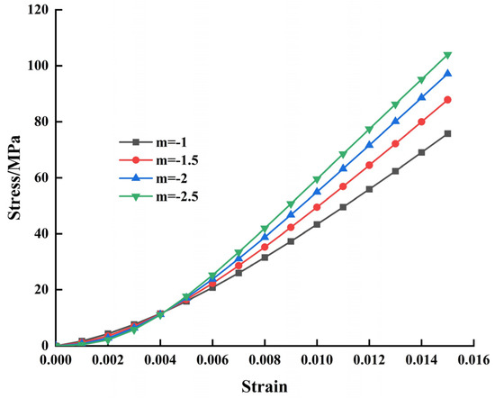 Taking the first-stage loading as an example, the fixed parameter λ0 value was 24.940, and the values of m were −1, −1.5, −2 and −2.5. The study results of parameter m are shown in Figure 13. When the stress level is less than 11 MPa, the theoretical curve decreases with the m value, and the concave degree of the curve increases continuously. Due to the large number of initial voids and cracks in the rock, the initial damage was large, and the strain should have been changed greatly under an equal stress grade. When the stress grade is greater than 11 MPa, the theoretical curve of the rock is steeper with decreases in the value of m. According to the steepness of the curve, as the curve becomes steeper, the elastic modulus becomes greater, the stiffness of the rock becomes greater, and its brittleness becomes greater. It was easy to determine the value of m, which controls the degree of brittleness of the rock. Under the same stress level, as the m value becomes smaller, the rock strain becomes greater, and the initial damage becomes greater. Under the action of cyclic stress, most of the work done by the initial stress of the rock acts on the initial damage compaction stage, and less work is done for the extension and expansion of rock cracks. Under the same external force, the total amount and growth rate of rock cracks decrease. Compared with the larger m value, the initial damage of the rock is smaller, the stress works earlier on crack propagation, and the cumulative number of cracks in the rock is larger. Therefore, it can be inferred that the level of m reflects the degree of crack propagation. As the degree of rock fracture propagation becomes greater, the level of m becomes greater. According to the physical meaning of the value of m, because the loading–unloading process of the sixth and seventh cycles approaches the rock failure stage, rock fracture extends and expands to a large extent, and its effect on the increase in the level of m exceeds the effect of the initial damage of the rock on the reduction in the level of m. The phenomenon of slight increases in m is also explained.
