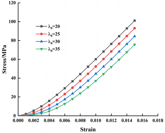 Similarly, taking the first-stage loading as an example, the fixed parameter m was −1.767, and the λ0 values were 20, 25, 30 and 35. The study results of parameter λ0 are displayed in Figure 14. As can be observed, the shapes of the theoretical curves under different λ0 values are generally similar. With increases in the value of λ0, the peak strength of the curve decreases continuously, and the curve becomes flatter. It is easy to conclude that parameter λ0 has an important impact on the average macroscopic strength of the rock.