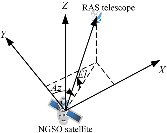 To calculate the interference of an NGSO fixed satellite service to an RAS telescope, the ITU-R M.1583 [26] gives a method based on the EPFD. Ensuring that the RAS telescope is not affected by harmful interference from NGSO satellite systems in any observation direction, the EPFD needs to be evaluated when the radio telescope is pointed in any direction. The model of the interference from the NGSO constellation to the RAS telescope is shown in Figure 1.