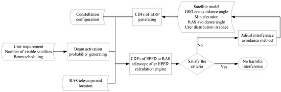 The flowchart for evaluating the harmful interference to an RAS telescope from an NGSO satellite system.