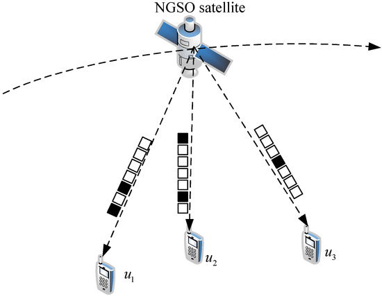 The NGSO satellites provide services to their users through an efficient allocation of time slots, which is shown in Figure 5. The diagram shows that a satellite is providing time slots to users within its coverage during a time window. The black squares indicate that the satellite is providing communication services to its corresponding user at this time, while the other time slots corresponding to other users are white. The diagram shows the NGSO satellite beam serving three user terminals in seven time slots. The beam is active in 5 slots and the probability of activation of the beam in this duration is . Here, the concept of beam activation probability is introduced; however, the beam activation probability cannot be determined, as it needs to be determined by the satellite operator according to the actual situation of the satellite system.
