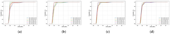 The CDFs of the EIRP at different directions is given in Figure 7. In Figure 7a, the direction corresponding to the elevation and azimuth angles of −2.5 degrees and −2.5 degrees, respectively, is located in the exclusion zone of the GSO satellite system; the direction corresponding to the elevation and azimuth angles of 57.5 degrees and −2.5 degrees, respectively, is located outside the coverage area of the NGSO satellite. The EPFD levels corresponding to these two directions are small for the same probability. This is mainly due to the fact that the beam cannot be pointed to the directions and therefore, the radiated EIRP is small. From Figure 7a–d, the CDF curves become tighter with different directions. This is mainly due to the natural separation between the NGSO and GSO satellite systems at high latitudes. There is no need to take any interference avoidance measures and the beam pointing within the satellite coverage is uniformly distributed. Therefore, there are similar CDFs of the EIRP within the coverage.
