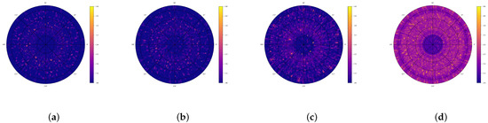 The EPFD of the RAS telescope with the beam activation of method 3: (a) the latitude of the RAS telescope is 0 degrees; (b) the latitude of the RAS telescope is 30 degrees; (c) the latitude of the RAS telescope is 60 degrees; (d) the latitude of the RAS telescope is 90 degrees.