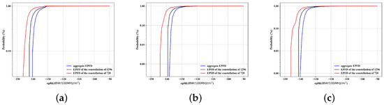 In the previous EPFD simulation of the RAS telescope, the EPFD was calculated only once for all directions of it. In order to obtain the EPFD distribution of the observation directions, several trails were required. The number of trails for the EPFD calculation was 2000 in order to obtain an accurate EPFD distribution. In the following figures, we give the CDF curves of the EPFD of the two satellite constellations, respectively, as well as their aggregate EPFD. The specific results are shown in Figure 12.