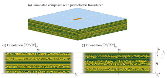Since both of the homogenized anisotropic waveguides are orthotropic with principal axes coinciding with directions and , they, as well as the initial cross-ply laminate, support propagation of in-plane EGWs along these directions. Therefore, for simplicity’s sake, the problem of EGW excitation, sensing, and scattering is considered further on within the plane-strain assumption (Figure 1b,c).