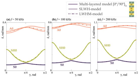 Within this study, two approaches for the evaluation of the elastic properties of such effective single layer are implemented, namely, SLWH and LWHM models. In the first one, the corresponding stiffness matrix is directly related to the sublayers’ elastic properties through the Equation (6). However, this approach does not take into account the peculiarities of the composite stacking sequence, i.e., identical matrices would be obtained either for symmetric or non-symmetric balanced cross-ply laminates with and . Since these equalities hold, the SLWH model is not capable of tackling the difference between EGW dispersion properties for and propagation directions typical for symmetric cross-ply composites [51]. In the proposed LWHM approach, this issue is addressed by evaluating through the optimization problem where angular dependencies of EGW dispersion curves solve as an input. However, their preliminary calculation is required and the solution of the corresponding minimization problem (7) should be performed.