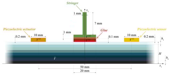 and the stress free boundary conditions in . In the case of the stringer being glued at the surface of the laminate , two adjacent domains and describing respectively the glue layer and the T-shaped stringer are introduced as depicted in Figure 3. Since the stringer and the adhesive are elastic and isotropic, governing equation (2) reduced for isotropy are employed. The outer boundaries of and are stress-free, whereas the displacement and the traction vectors are assumed continuous at the interfaces and so that relations identical to (15) hold there.