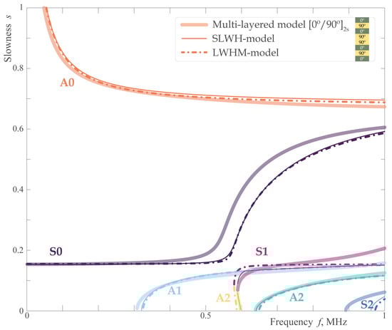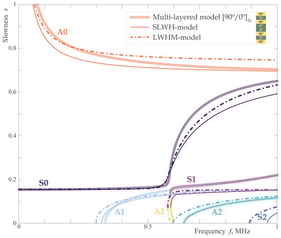 First, let us compare the dispersion characteristics of the 8-layered anisotropic symmetric laminate and two homogenized single layer waveguides, which properties are determined using the SLWH-model and the LWHM-model described in Section 2.1.2. Figure 4 and Figure 5 depict the slownesses of EGWs propagating for two orthogonal orientations of the considered composite, i.e., and . One can see that for the first of them both homogenized models provide similar results and are capable to predict adequately the behavior of fundamental and high-order antisymmetric waves in a multilayered waveguide including the values of their cut-off frequencies. The particular benefit of LWHM-model here is that for mode the dispersion curve evaluated with it is closer to the results of the complete multi-layered model than the one obtained with the SLWH-model. For symmetric modes, good coincidence between multi-layered and homogenized models is observed only for mode and for the frequency range where it is almost non-dispersive, i.e., up to kHz. With the increasing frequency, not only the particular trajectories of for symmetric modes become dissimilar but the values of cut-off frequencies are also not properly addressed (e.g., for mode).