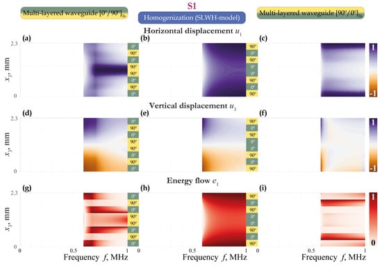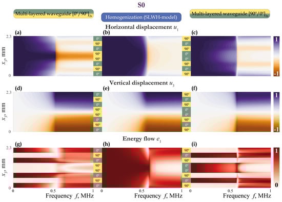 Eigenforms for the first fundamental guided wave S0 propagating in multi-layered waveguide (a,d,g), homogeneous waveguide according to the SLWH-model (b,e,h), and multi-layered waveguide (c,f,i).