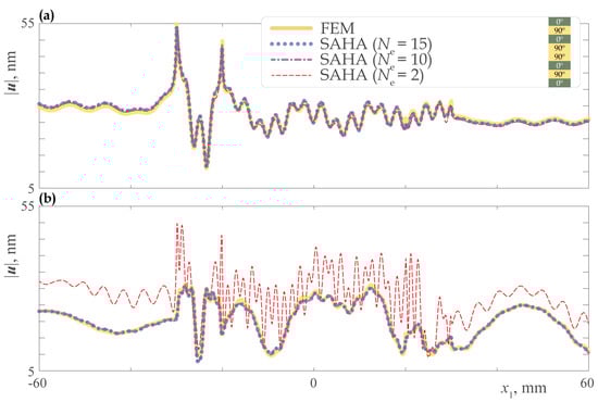 As a starting point, the accuracy of the SAHA in the case of an anisotropic waveguide is illustrated. Figure 10 demonstrates total displacement amplitudes calculated for composite using the SAHA with different number of elements discretizing the PWTs along -axis and the conventional FEM (COMSOL Multiphysics 6.0; COMSOL AB, Stockholm, Sweden). In the latter, perfectly matched layers are employed to simulate an infinite waveguide, and 2,083,295 degrees of freedom (DoF) in total have been used with quintic polynomial approximation. Such a big amount of DoF is conditioned by the fact that each sublayer was discretized at least with three FE along its thickness, and very fine mesh in the contact areas between the PWTs and the waveguide was employed. Here and further on for the numerical results presented, PWTs of length mm and thickness mm with mechanical and piezoelectric properties listed in Table 3 have been used (both for the actuator and sensor). One can see that only of elements are enough in the SAHA to achieve a good accuracy.