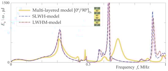 With the provided numerical results, it is illustrated that effective single layer models cannot exactly predict the dynamic behavior of symmetric cross-ply laminates fabricated from unidirectional prepregs. Even for the fundamental mode, its dispersion properties evaluated within SLWH and LWHM models and multi-layered model differ for the orientation related to the plane-strain problem for sample. If the pair of PWTs, i.e., actuator/sensor, mounted on the surface of an 8-layered symmetric laminate is considered, both effective models give results that are qualitatively similar to the multi-layered model only at low frequencies (approximately up to 150–200 kHz). The discrepancy becomes larger and the frequency range, where the effective models are valid, decreases if the T-shaped stringer is glued on the surface of the laminated structure. The reason is naturally revealed: differences in sensor response evaluated either with single layer models or for the initial multilayered structure both for intact waveguide or a laminate with a surface-mounted stringer could be explained by the fact that in the homogenized models the information about the stiffness of the upper sub-layer is smeared through the whole thickness of the waveguide. This parameter is essential for the quantitative evaluation of the energy transfer along the composite, ultimately affecting output voltages from the sensor, especially when a surface obstacle is present.