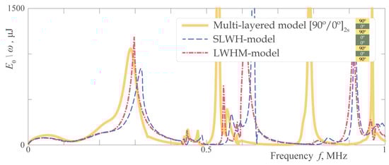 Corresponding values of induced by the piezoelectric actuator mounted on the surface of the multi-layered waveguide are shown in Figure 11 and Figure 12 for and , respectively. For both waveguides, the results provided by homogenized models are comparable with the data from the multilayered one up to the frequency kHz. Moreover, when kHz, good quantitative coincidence is also observed for the laminate. At the same time, for structure, curve evaluated with the LWHM-model is closer to the one obtained with the multilayered model, although, in general, the discrepancy is higher.