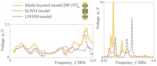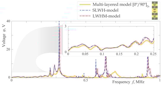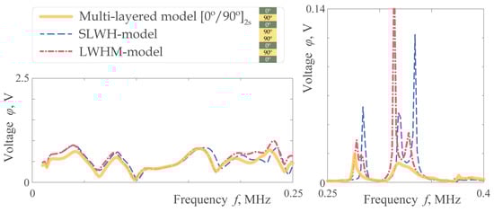 Figure 13, Figure 14, Figure 15 and Figure 16 show the response of the piezoelectric sensor to guided waves excited by the actuator for the considered models. The first two are obtained for an intact structure, while Figure 15 and Figure 16 are calculated for a waveguide with a T-shaped stringer adhesively attached to its upper surface (geometric parameters of this obstacle and adhesive are provided in Figure 3, while their mechanical properties are summarized in Table 4). As in the previous cases, the models are in qualitative agreement with each other at lower frequencies. When, however, is quantitatively compared, acceptable results for the waveguide are obtained in a rather narrow frequency range (below 20 kHz) while for the laminate it is wider (below 200 kHz) (zoomed parts in Figure 13 and Figure 14). If the scattering by the stringer is additionally considered, the coincidence of the homogenized models with the multi-layered laminate model is mainly qualitative, but not quantitative. Here again, the LWHM-model predicts the dynamics of the laminate more accurately than the SLWH-model. The values and local maxima of the voltage measured via the sensor are shown in Figure 15 and Figure 16 (up to 400 kHz for and waveguides).