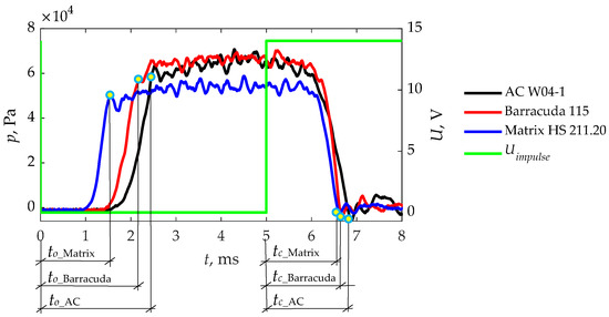 - Shortest opening time (calculated from the beginning of the control pulse) was obtained for the Matrix HS 211.20 injector and was 1.54 ms; the Barracuda 115 injector`s time was longer by 29.3% (2.18 ms), while the AC W01-4 injector’s time was longer by 36.6% (2.45 ms);