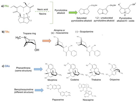 Figure 2. (a) Common chemical structure of pyrrolizidine alkaloids and different forms for pyrrolizidine alkaloids (R1 and R2 correspond to different necic acids); (b) General common chemical structure of tropane alkaloids (TAs), and chemical structure of the main TAs: atropine and scopolamine; (c) Chemical structures of the two families of opium alkaloids (phenanthrenes and benzylisoquinolines).