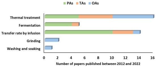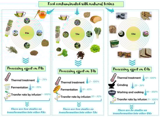 As indicated above, PAs, TAs and OAs have been detected and regulated in many commodities [6,7,8,9,10,11,12]. However, it is also of high interest to evaluate the effect of food processing and culinary preparations on these alkaloids. Accordingly, some of the most notable works regarding thermal treatment, fermentation, transfer rate by infusion and other treatments (i.e., grinding, washing and soaking) are described below. Moreover, Figure 3 gathers and classifies a of number works currently available in the literature addressing this issue in the different target alkaloids. Likewise, Figure 4 summarizes the occurrence and effect of food processing and culinary preparation on PAs, TAs and OAs according to the available literature.